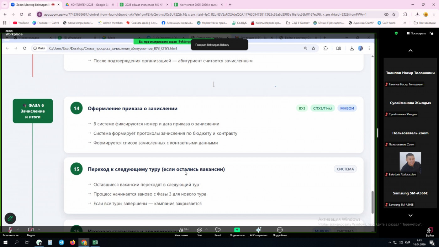 Семинардын алкагында "Санариптештирүү борбору" МИнин директору Бабаев Б.Н. Жалпы республикалык тестирлөөнүн (ЖРТ) жыйынтыктарын колдонуу менен абитуриенттерди кабыл алууну уюштуруунун негизги ыкмалары боюнча презентация жасады. Семинардын катышуучуларына кабыл алуу тартибин жөнгө салуучу ченемдик укуктук актылар боюнча толук түшүндүрмөлөр берилди, ошондой эле медициналык колледждерде кабыл алуу кампаниясын уюштуруу боюнча кадамдык нускамалар сунушталды. Иш-чаранын жыйынтыгында кызыкдар тараптардын ортосундагы өз ара аракеттенүүнүн мындан аркы багыттары белгиленип, конструктивдүү диалогду улантуу боюнча макулдашууга жетишилди.