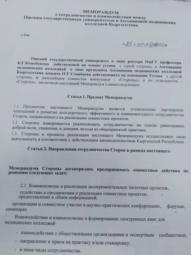 On November 25, 2022, Osh State University and the Association of Medical Colleges of Kyrgyzstan signed a memorandum "Cooperation and Interaction".