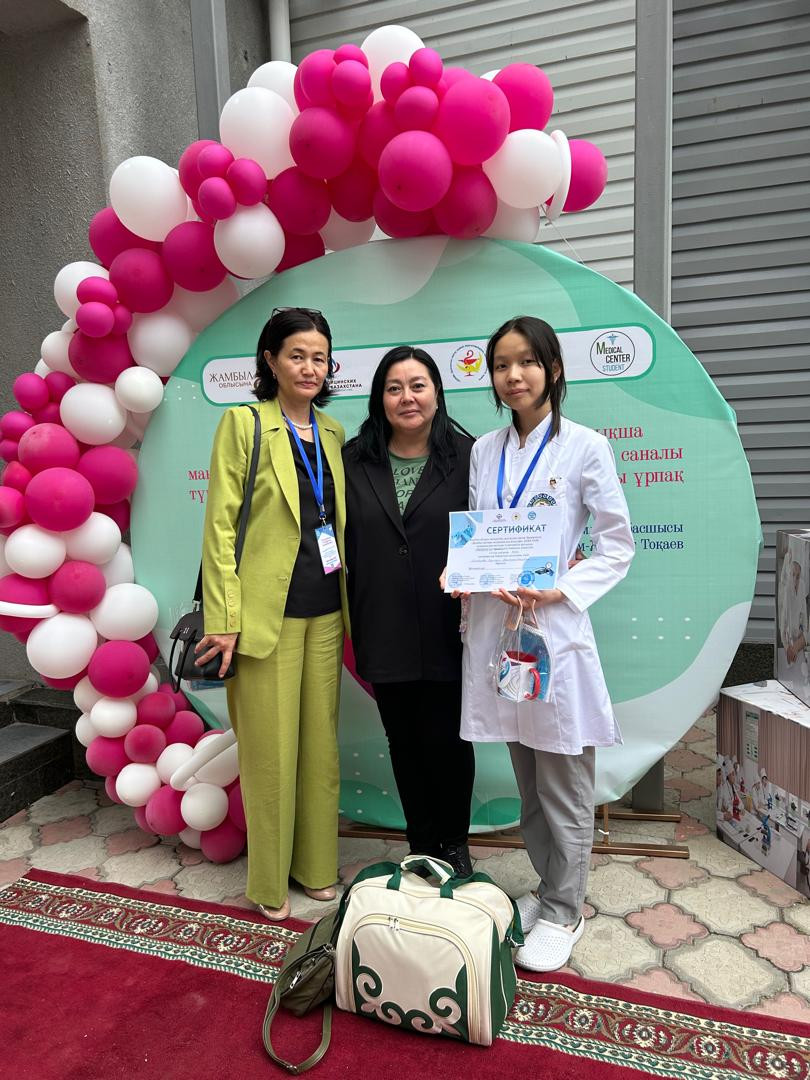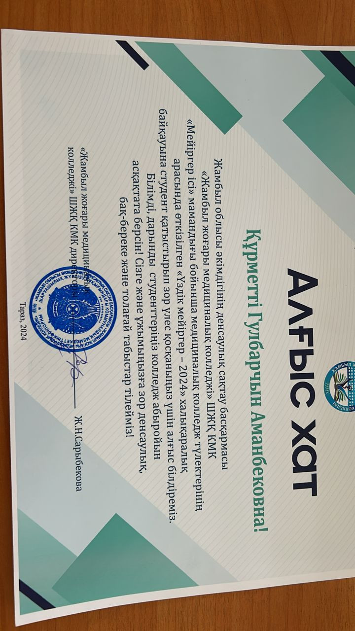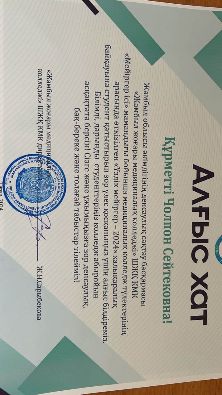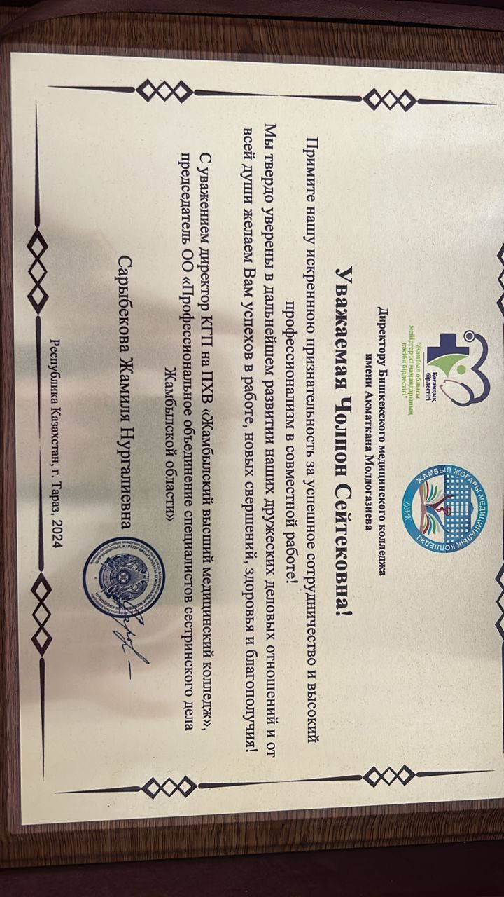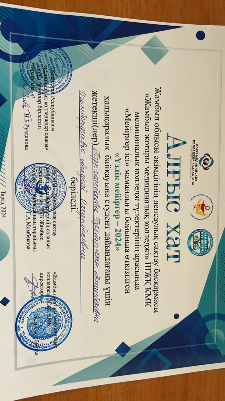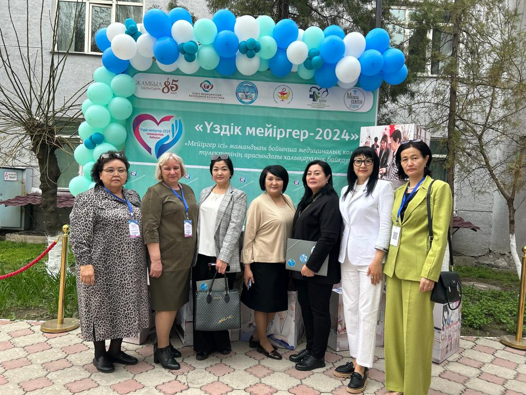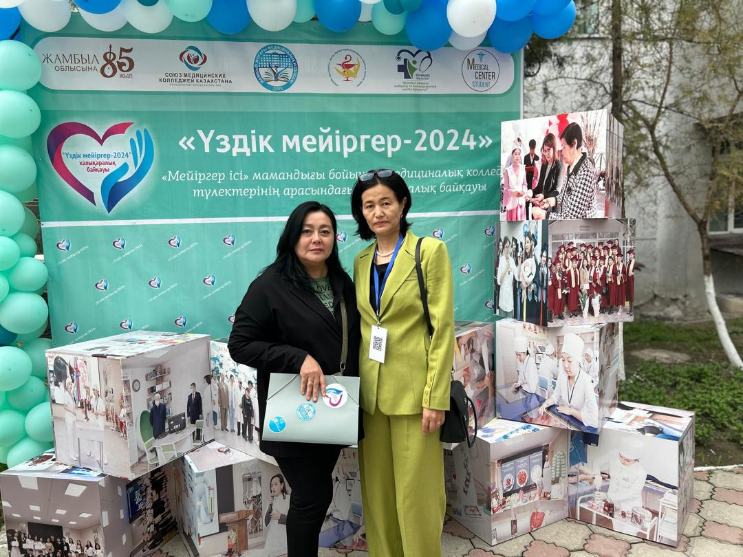2024-жылдын 12-апрелинде  боордош Казак Республикасынын  Жамбыл облусунун   85 жылдыгынын  урматына медициналык  колледждер арасында студенттердин эл аралык “Мыкты медайым-2024” аталышындагы  конкурсу болуп өттү. Иш-чарага А.Молдогазиев атындагы Бишкек медициналык колледжинин Окуу-усулдук борборунун башчысы Г.А.Турганбаева, борбордун усулчусу А.Ө.Эгембердиева, колледжинин студенти Шабиева Бермет Талантбекова катышып келишти. Конкурс 4 этап менен өткөрүлдү.