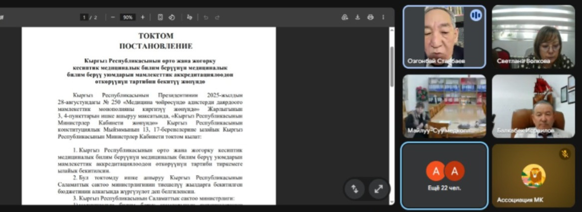 On April 20, 2026, the Association of Medical Colleges of the Kyrgyz Republic held an information and discussion meeting on the Order No. 254 of the Order of State Accreditation of Medical Educational Organizations of Secondary and Higher Professional Medical Education and Order No. 240 of the Order for Admission to the Educational Organization of Secondary Professional Medical Education in the Kyrgyz Republic.