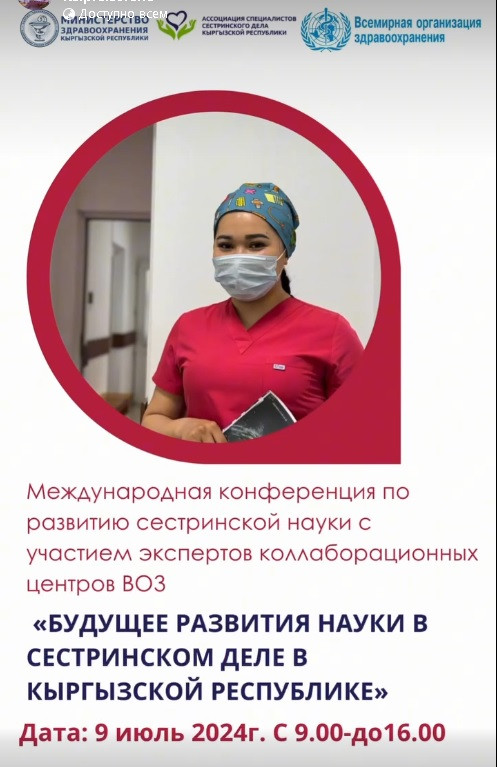 2024-жылдын 9-10-июль күндөрү ДСУнун кызматташуу борборлорунун эксперттеринин катышуусунда медайымдык илимди өнүктүрүү боюнча “Кыргыз Республикасындагы медайымдык иштеги илимдин келечеги” аттуу эл аралык конференция өттү. Конференция оффлайн жана онлайн режиминде өтүп, медайымдар ишин өнүктүрүүнүн актуалдуу маселелери жана келечеги талкууланды. Аталган конференцияга Саламатык сактоонун жана Билим берүү жана илим министрликтердин, Кыргыз мамлекеттик медициналык академиясынын өкүлдөрү, Кыргызстандагы медициналык колледждердин ассоциациясы, Медайым кызматкерлердин кесиптик ассоциациясы, пилоттук медициналык колледждердин окутуучулары катышышты.