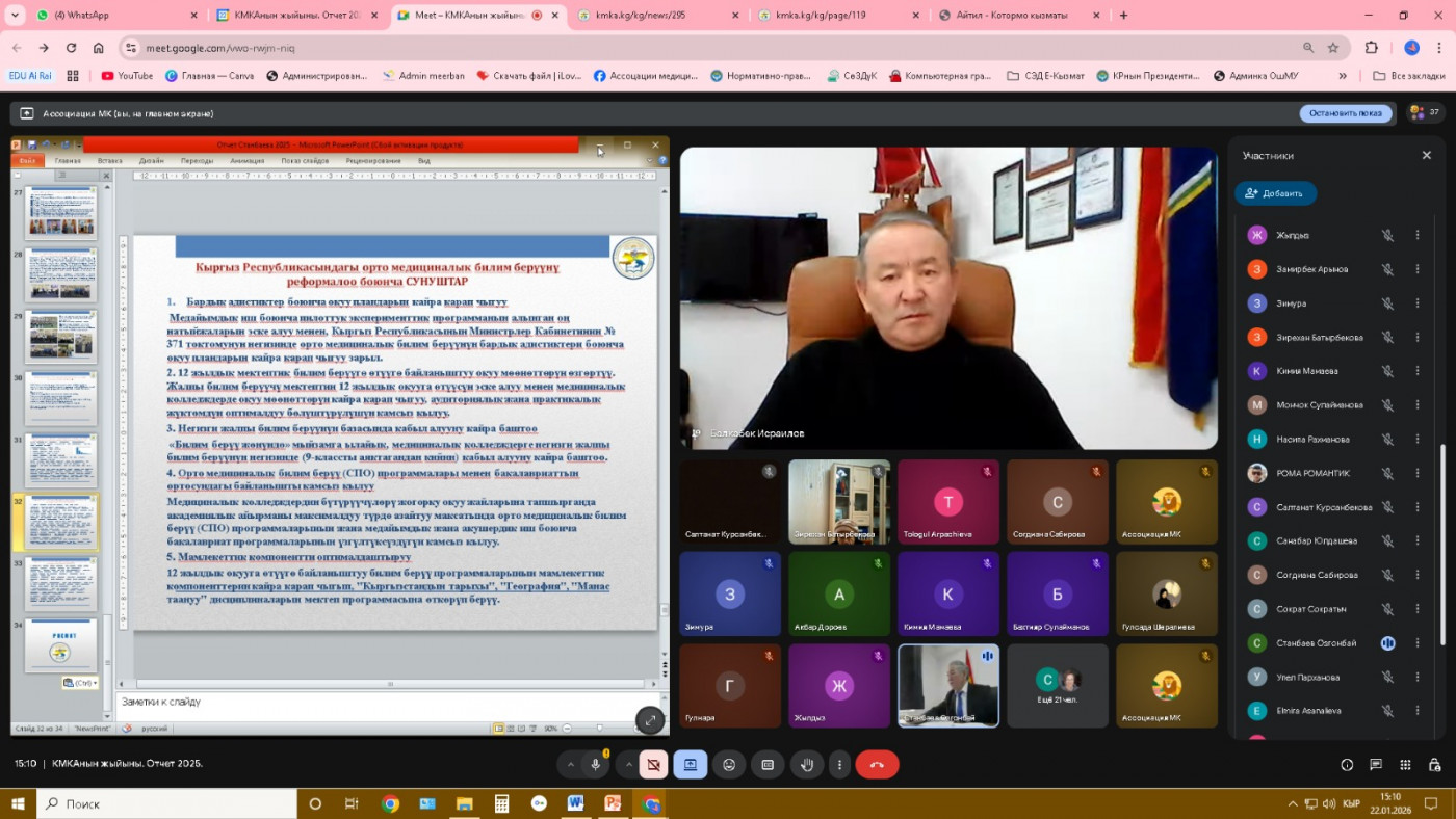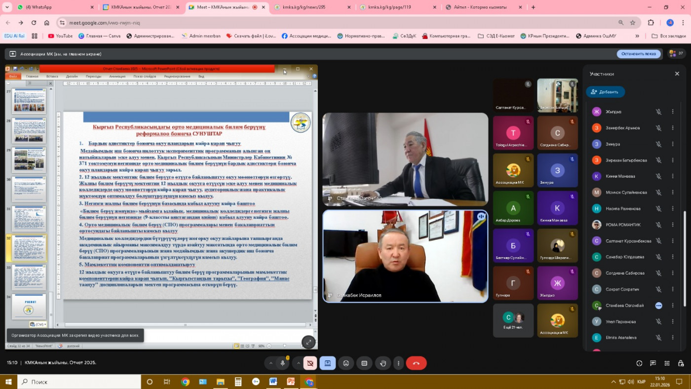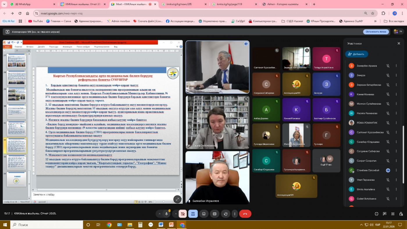 2026-жыл 22-январь күнү Кыргызстандагы медициналык колледждердин ассоциациясынын (КМКА) жалпы жыйыны болуп өттү. Жыйынга Ассоциациянын мүчөлөрү жана медициналык колледждердин өкүлдөрү катышып, Саламаттык сактоо министрлигинин Медициналык билим берүү жана илим бөлүмүнүн башчысы З.А.Долонбаева жыйынды ачып берди.