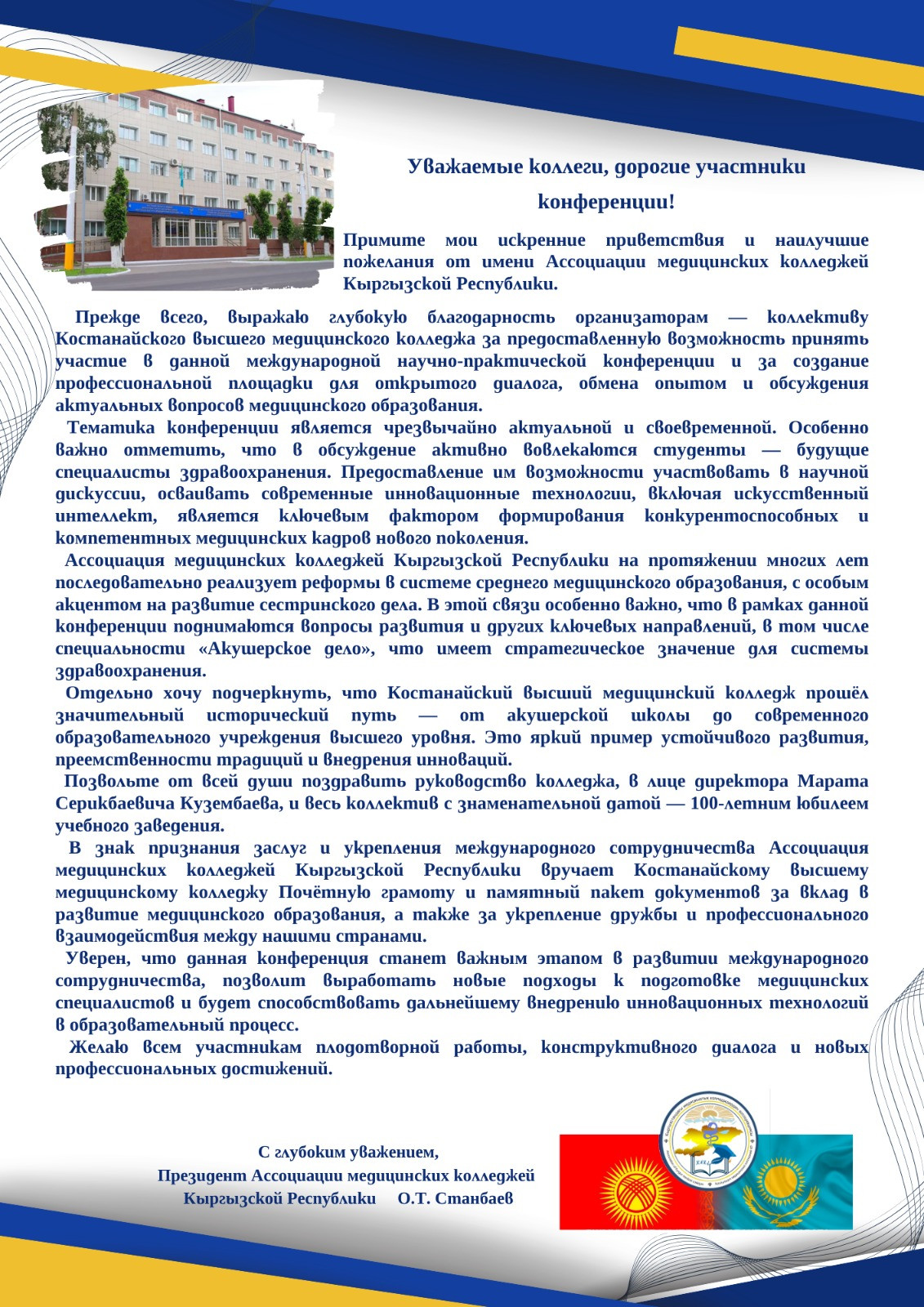 Кыргызстандын медициналык колледждеринин ассоциациясынын президенти О.Т. Станбаев Костанай жогорку медициналык колледжи тарабынан уюштурулган «Акушердик билим берүү жана практиканын сабакташтыгы: аудиториядан клиникага чейин» аттуу эл аралык илимий-практикалык конференцияга катышты.